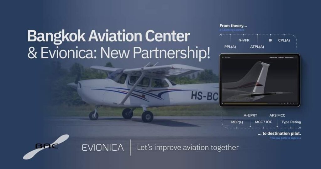 Bangkok Aviation Center is a recognized leader in aviation training technology, promoting excellence in aviation training and offering their students courses from PPL(A) to ATPL(A) and beyond. Evionica will support BAC throughout the journey, providing the latest e-learning tools and theory training materials. BAC’s team of highly experienced and dedicated instructors will deliver the most up-to-date and accurate aviation e-learning solutions tailored for the modern learner. Renowned for its quality, safety, reliability, and absolute commitment to aviation training, BAC is where your dreams of becoming a pilot take flight.